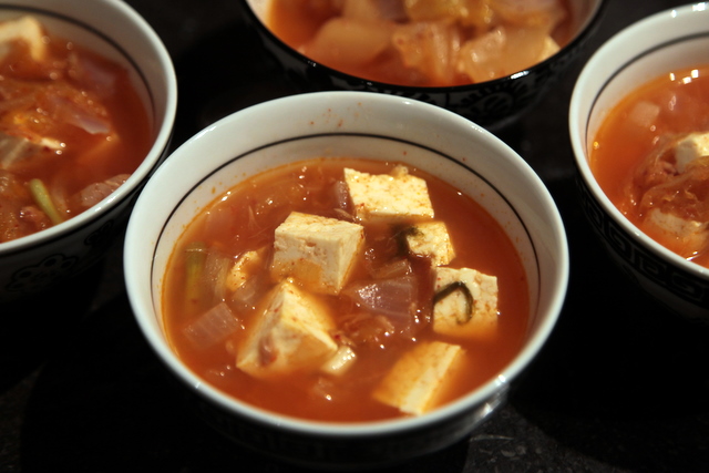 Dans une casserole, mettez le kimchi et l’eau. Portez à ébullition. Quand l’eau bout, ajoutez l’oignon, le thon (avec un peu d’huile si à l’huile), l’ail et un peu d’huile végétale (sauf si vous utilisez du thon à l’huile). Poursuivez la cuisson à petits bouillons 15 min. Versez alors les oignons nouveaux et le tofu.